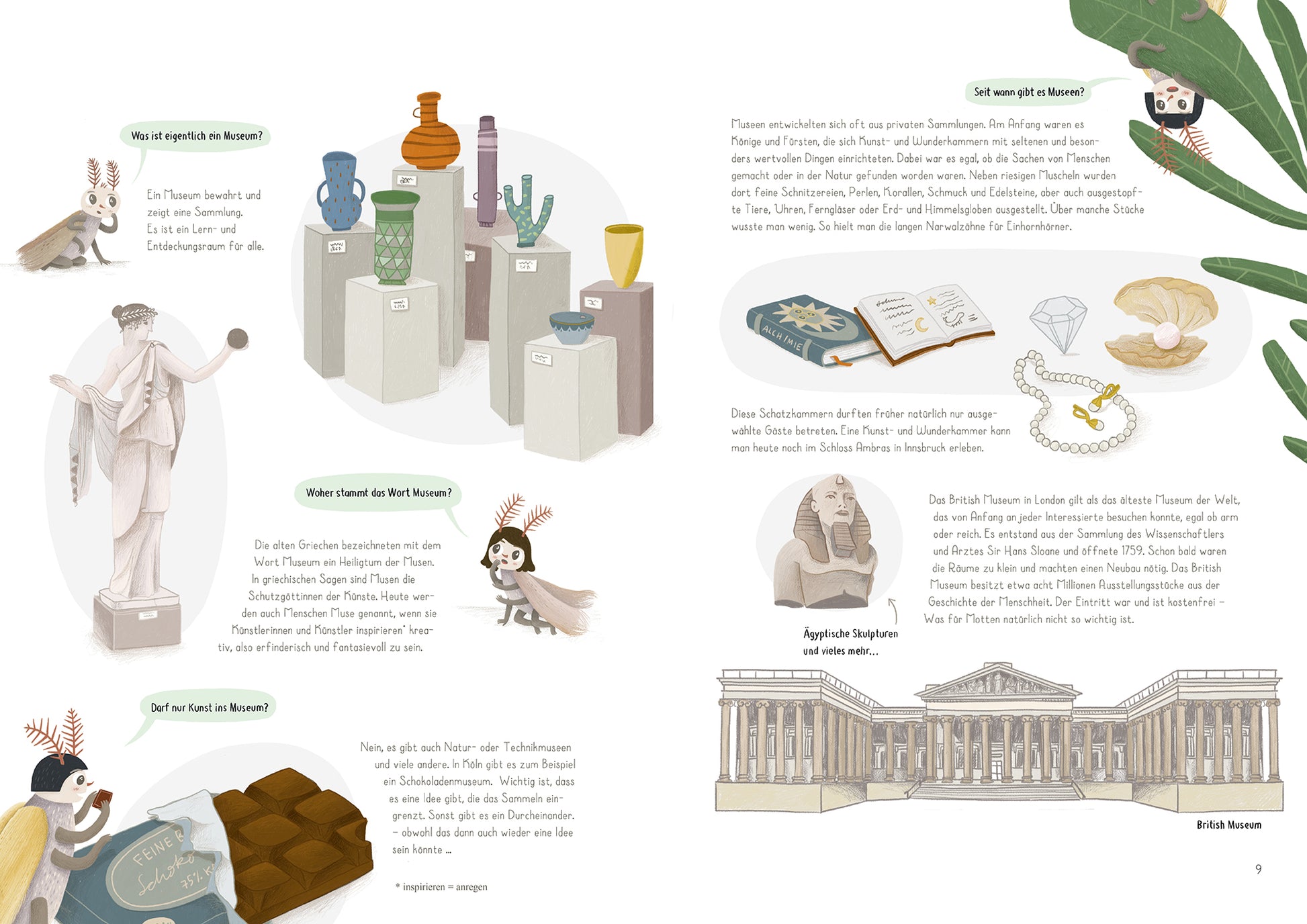 Maike Jacobs, Neue Presse Hannover„Dieses erzählende Sachbilderbuch vermittelt Kindern auf anschauliche und unterhaltsame Art die Bedeutung von Kunst und Museen. Die lebhaften Frage-Antwort-Gespräche der sympathischen Mottencharaktere werden ergänzt mit kurzen Sachinformationstexten, die alle relevanten Aspekte des Museumslebens einfach und kindgemäß darstellen“