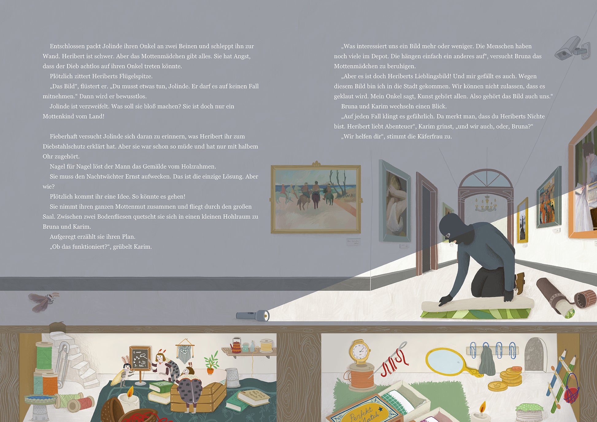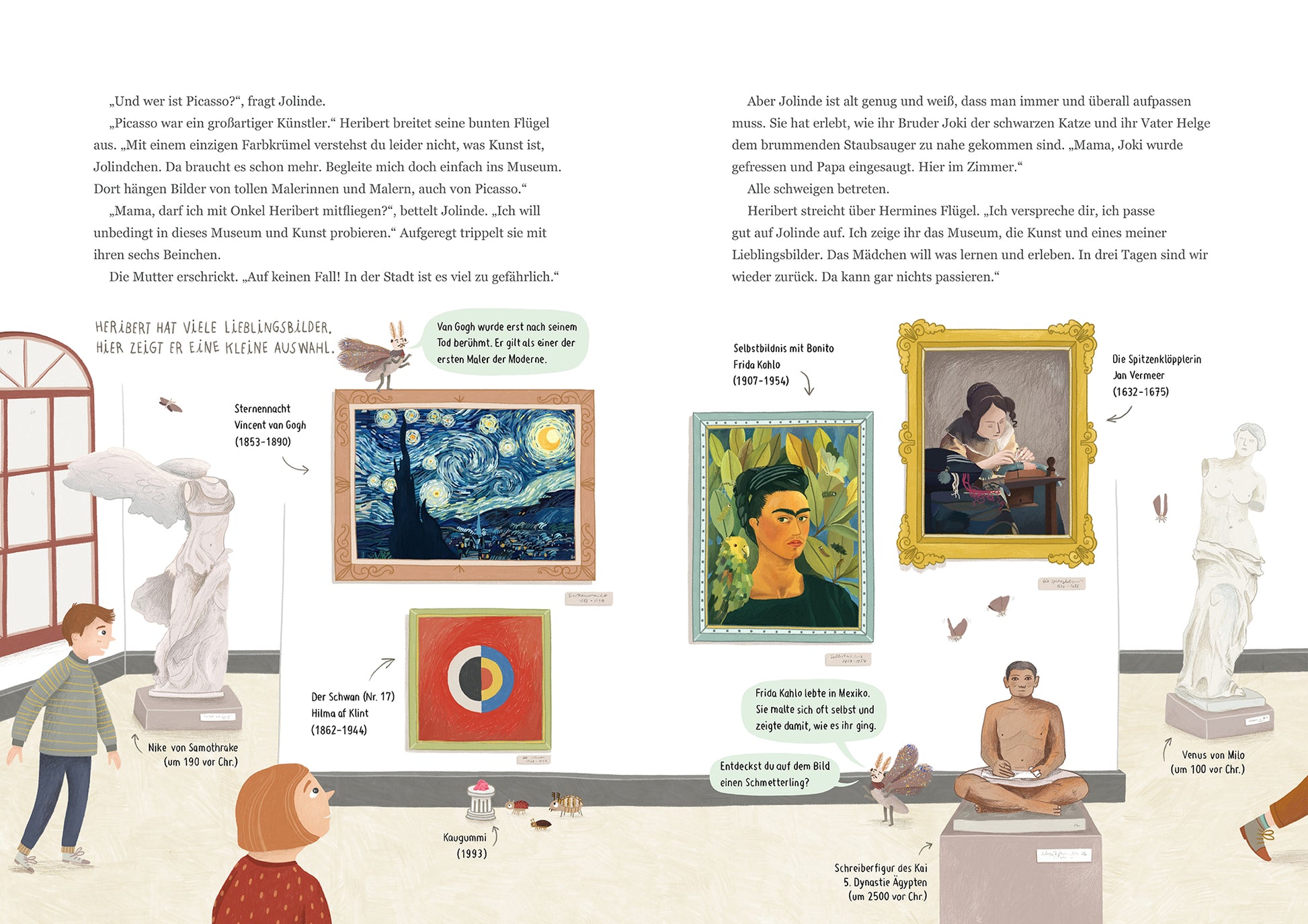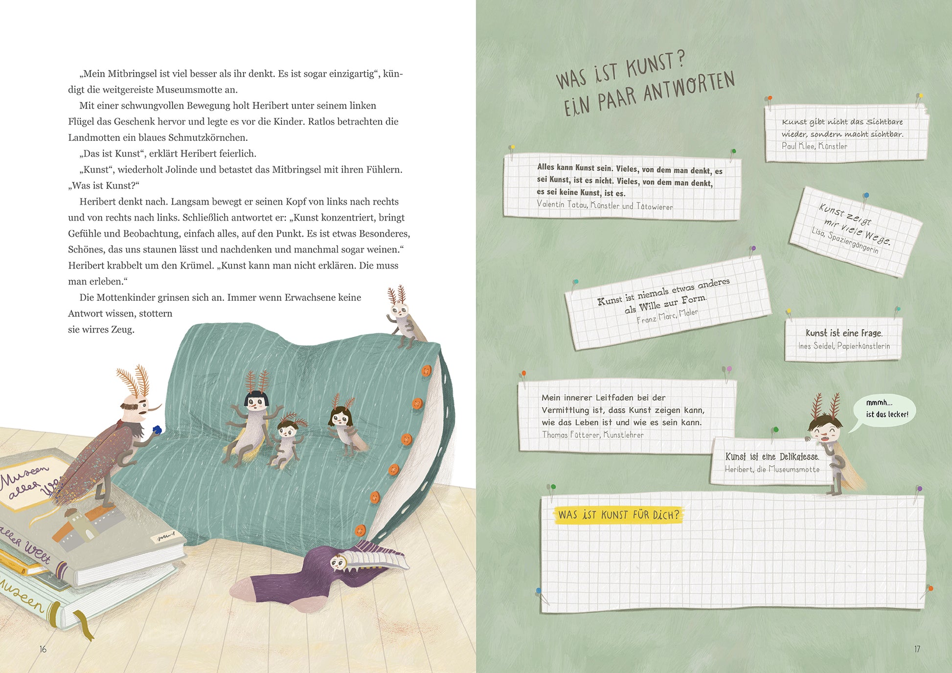 Jenni, @jennis_kinderbuch_regal„Das Buch ist lustig und wunderschön illustriert und die Informationen sind in die Geschichte der Mottenfamilie verwoben. Es gibt kaum ein Thema in der Kunst, was nicht wenigstens kurz angesprochen wird. Daher eignet sich das Buch sehr gut als Einteig in das Thema oder generell vor einem Museumsbesuch.“