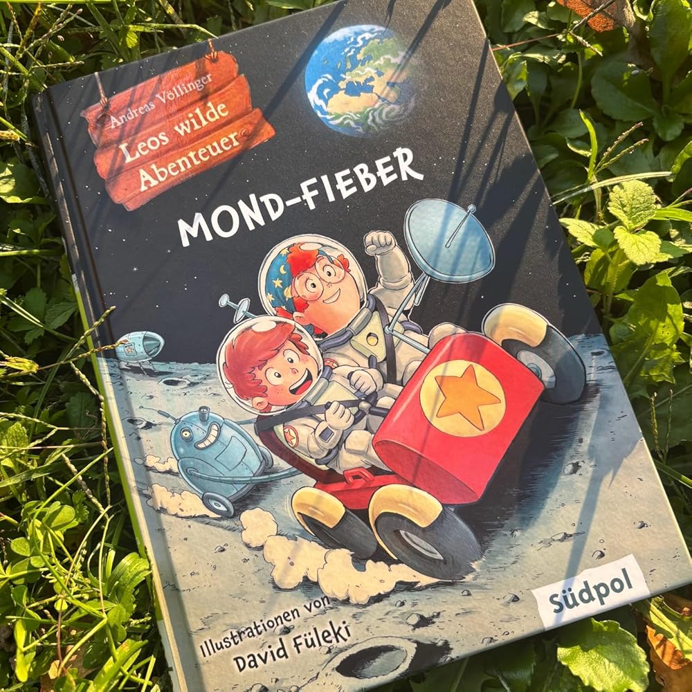 Ein neuer Band der Erstlesereihe für Fortgeschrittene „Leos wilde Abenteuer“ aus dem Südpol Verlag ist am Start. Nachdem Leo bereits im Dino-Alarm war und das Käfer-Chaos überlebt hat, ist er nun im „Mond-Fieber“. Ohh ja. Es geht zum Mond. Wer die Reihe von Autor Andreas Völlinger bereits kennt, der weiß, dass Erfinder-Tante-Agnetha zu allem bereit und fähig ist.Das Buch punktet mit einfach formulierten Texten, kurzen Kapiteln und großer Schrift – sowie mit den absolut witzigen Illustrationen von David Füleki, die den Lesespaß gleich noch steigern. Im Hardcover mit passend gestaltetem Vorsatzpapier darf ein schön übersichtliches Inhaltsverzeichnis und eine Übersicht zu den wichtigsten Protagonist*innen nicht fehlen. So kann man auch quer in die Reihe einsteigen.Leo ist völlig aufgeregt auf dem Weg zu seiner Tante, denn er hatte Geburtstag und nun soll er noch ihr Geschenk bekommen. Haushaltsroboter Albert versucht vergebens, Leo davon abzuhalten in den Garten zu laufen. Er soll im Haus warten, denn Tante Agnetha baut draußen noch am Geschenk. Doch Leo entwischt Albert. Herrlich witzig diese Szene und die Dialoge. Denn Albert kann als Roboter nicht lügen. Er ist in diesem Band mein heimlicher Star, einfach zum Piepen dieser Roboter und die Situationskomik, die sich aus dem Umgang mit ihm ergibt.So, nun aber zurück zur Geschichte. Das riesige Etwas im Garten ist gar nicht das Geschenk, sondern das, was Tante Agnetha braucht, um Leo ein Geschenk zu machen: es ist ein Raumschiff und damit soll es zum Mond gehen, denn Leo wollte schon immer auf dem Mond spazieren gehen.Dann geht es los, das verrückte Mond-Abenteuer und neben super aufregenden und spannenden Momenten, wird es natürlich auch brenzlig und fast lebensgefährlich. Nebenher erfahren die jungen Leser*innen noch einiges Wissenswertes über die erste Mondlandung und spätere Mondmissionen. Warum Albert Mond-Fieber bekommt, ein Buch zur Rettung beiträgt und welche Rolle Katze Katinka in diesem Band spielt, das erfahrt ihr, wenn ihr das Buch selbst lest.Der Textumfang ist schon recht hoch für ein Erstlesebuch. Ich würde es ab Ende Klasse 2 empfehlen. Wie schon beim „Käfer-Chaos“ hatte ich selbst ganz viel Spaß beim Lesen. Die Geschichte lebt von lustigen und schlagfertigen Dialogen und den tollen Illustrationen, die den jeweiligen Moment sehr schön inszenieren.Haushaltsroboter Albert ist einfach genial komisch, die kratzbürstige Katinka eine sehr „charakterstarke“ Katze. Das Duo aus Tante und Neffe ist herrlich erfrischend. Und nebenher gibt es noch gut verdauliche Wissenshäppchen.„Leos wilde Abenteuer – Mond-Fieber“ hat mich wieder sehr gut unterhalten und ich finde die Reihe super für den Übergang von Erstlesebüchern zu „richtigen“ Romanen. Außerdem kann man Punkte bei Antolin sammeln. Jungen und Mädchen werden sich gleichermaßen von der Story angesprochen fühlen.Ich empfehle „Mond-Fieber“ sehr gern weiter.