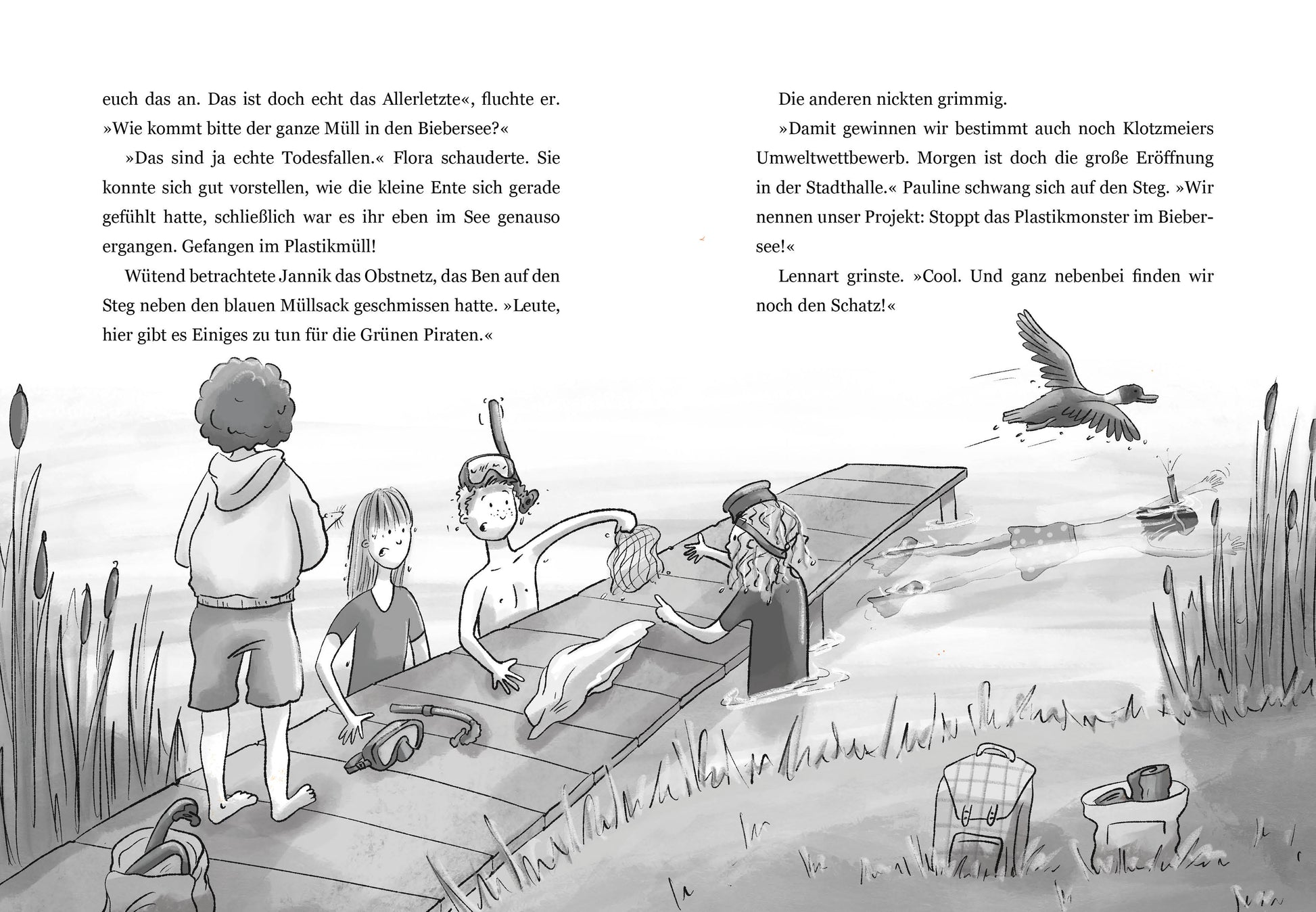 Plastikmonstern auf der Spur – Ein neuer Fall für die Grünen Piraten Im Biebersee wurde ein Monster gesichtet, doch auf einem Tauchausflug entdecken Ben, Flora, Pauline, Lennart und Jannik etwas viel Schlimmeres: Ein riesiges Gebilde aus Plastiktüten und -fetzen geistert durchs Wasser und nur mit Mühe können die Freunde eine Ente befreien, die sich in den Schnüren verheddert hat. Die Grünen Piraten sind entsetzt. Wie kommt das ganze Plastik in den Biebersee? Der Umwelt-Wettbewerb, den Bürgermeister Klotzmeier ausruft, um sein ramponiertes Image aufzupolieren, kommt den Grünen Piraten gerade recht, um verdeckte Ermittlungen anzustellen ...