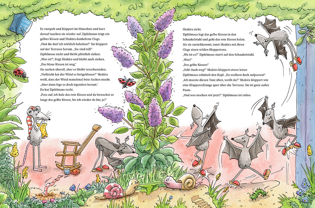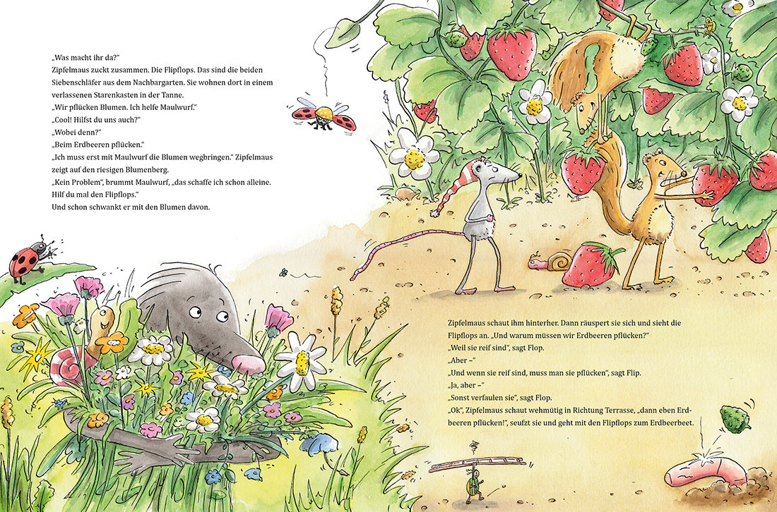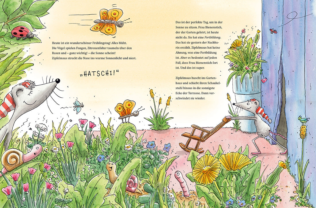 Zipfelmaus will heute den ganzen Tag gemütlich im Schaukelstuhl auf der Terrasse faulenzen, aber dann ist plötzlich ihr Kissen verschwunden. Kaum holt sie sich ein neues, ist die Frühstücksrosine weg. Wenig später sogar der ganze Schaukelstuhl! Und nicht nur das, ständig kommt einer ihrer Freunde vorbei und braucht Hilfe: beim Aufräumen, beim Blumen pflücken, beim Erdbeeren ernten! Was ist da nur los in Frau Bienenstichs Garten?